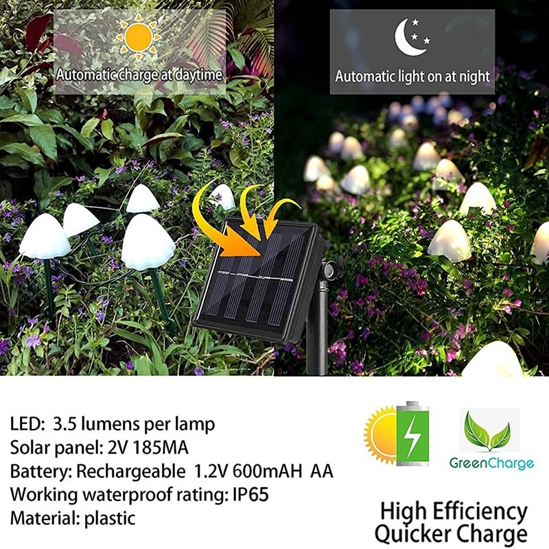 LED solar string lights has shaped by a high simulated mushroom decor,looks like real mushroom in your garden,will beautifully dress up your tree, fence, front path or porch, creating a warm and sweet atmosphere.